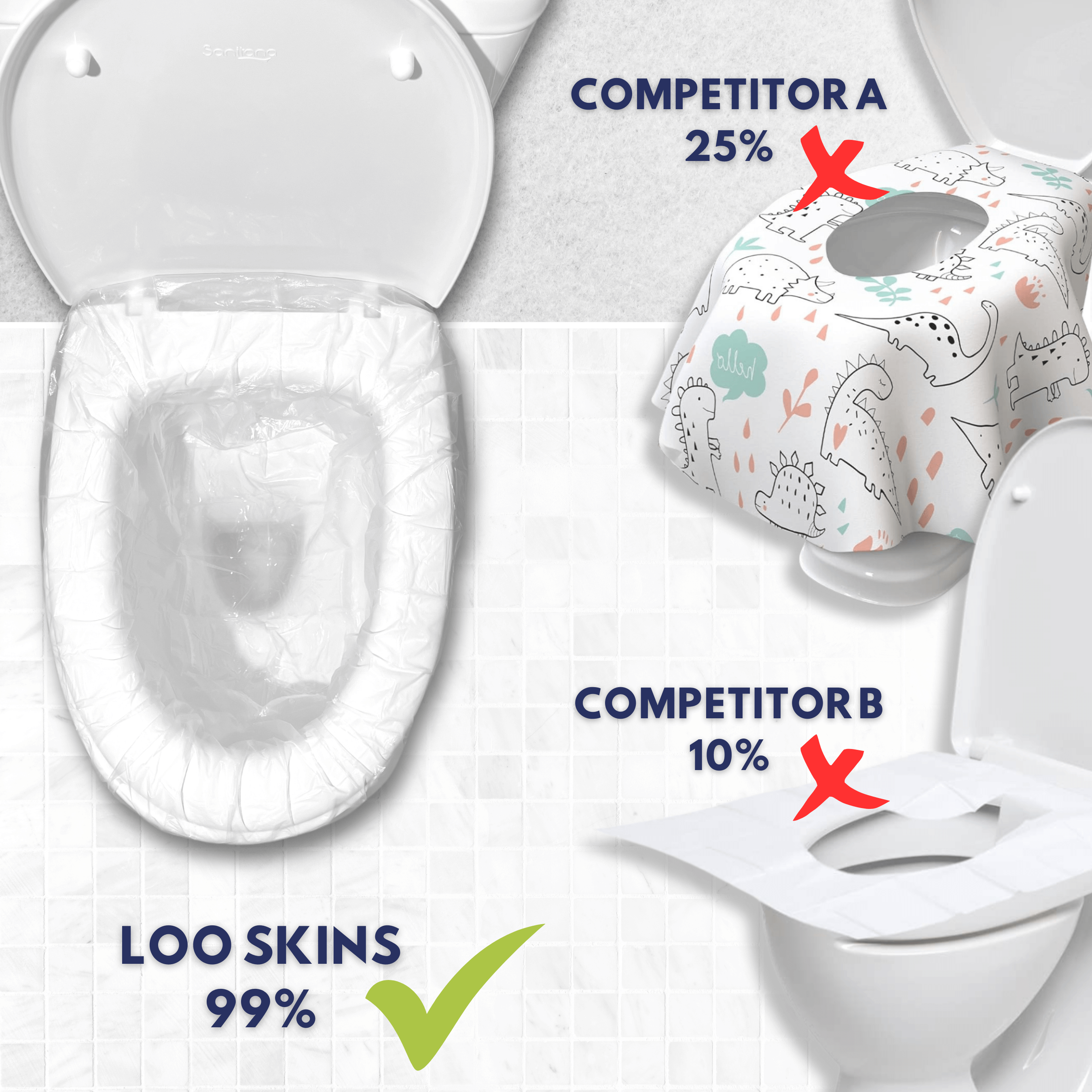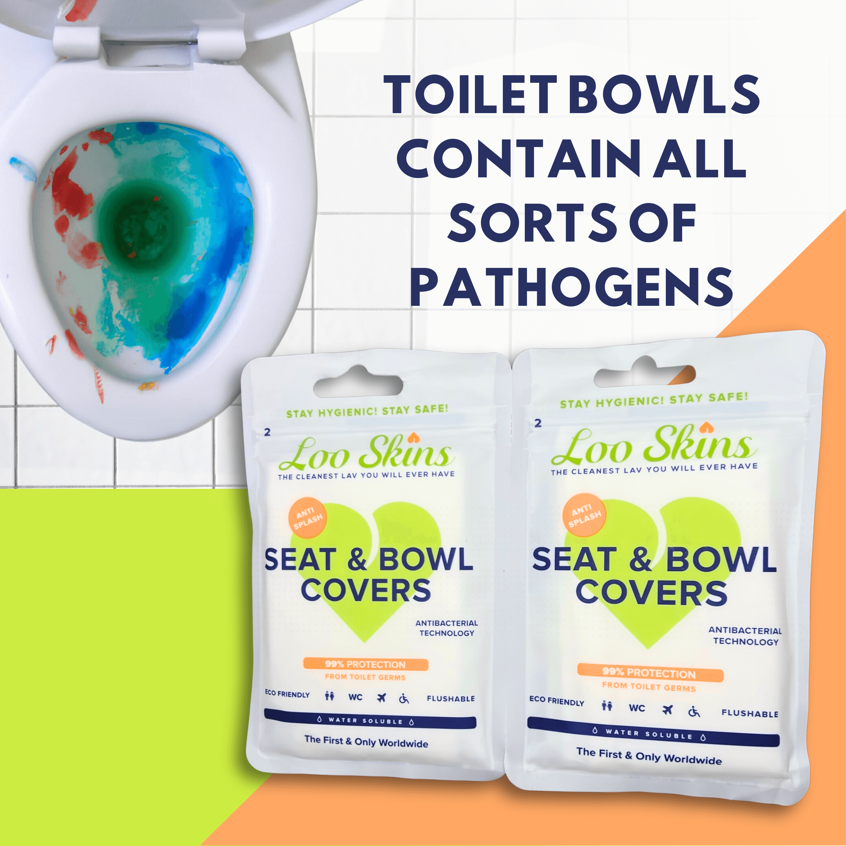 Loo Skins protects you and your family from several transmissible pathogens present in toilet bowls of various public toilets.